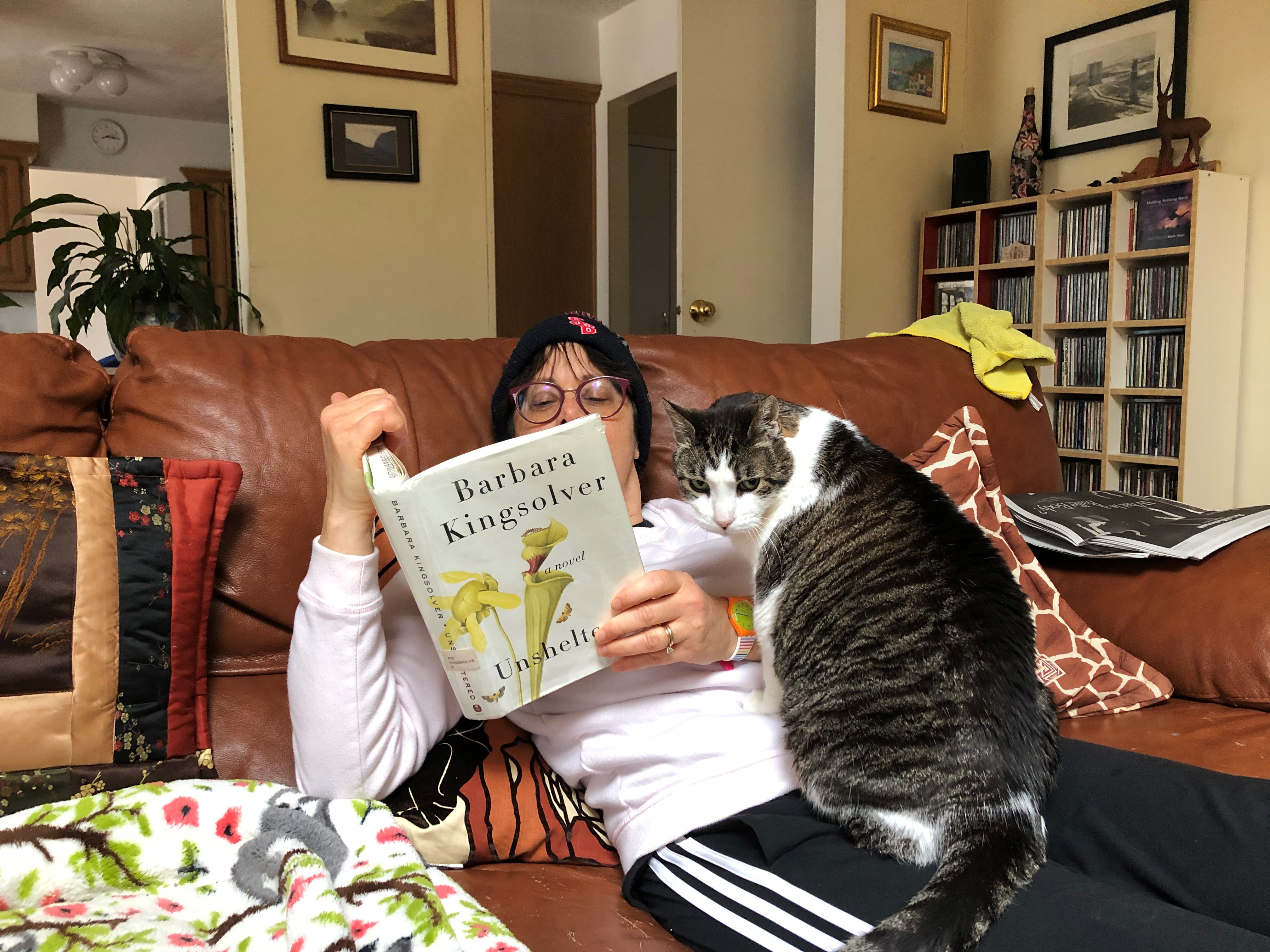 We also often have very differing opinions on the books. But none of that matters in the least. What we have is community, camaraderie, friendship and meaningful discussions. And I love the fact that when I’m reading these old-school paper books (not a screen) I know they are too, and I often have my furry feline reading companions Lucy and Will on my lap or right there by my side.
